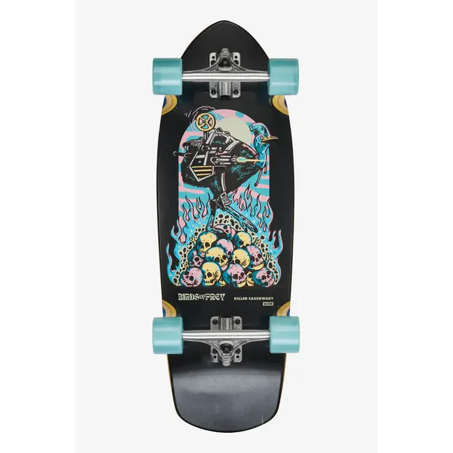 Wide, steady platform carving board on tight-turning reverse kingpin trucks. The Stubby 30 in Killer Cassowary features Mellow concave with kicktail and is constructed from Resin-7 hard rock maple.