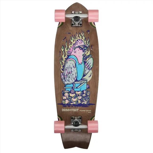 Surf-inspired swallow-tail cruiser. The Sun City in Flamin' Galah features Resin-7 hard rock maple deck construction with mellow concave and kick tail. Also features 5.25” Tensor alloy trucks and 62mm 78a conical cruiser wheels for a smooth ride.