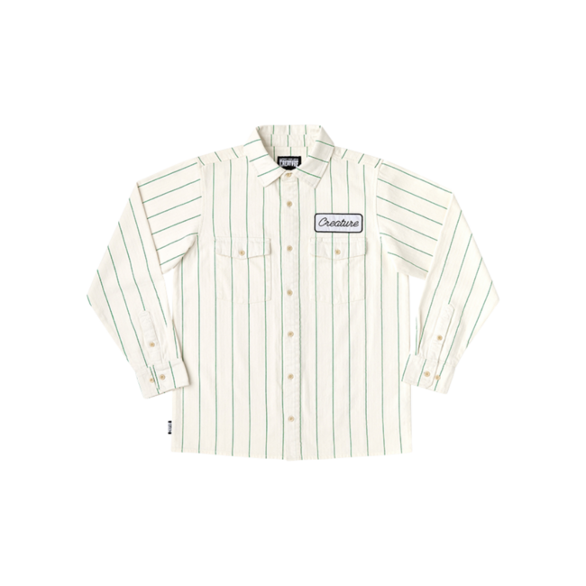 Creature Transmission LS Work Shirt features durable cotton, classic pinstripes, dual chest pockets, and bold Creature skate styling. Read more.